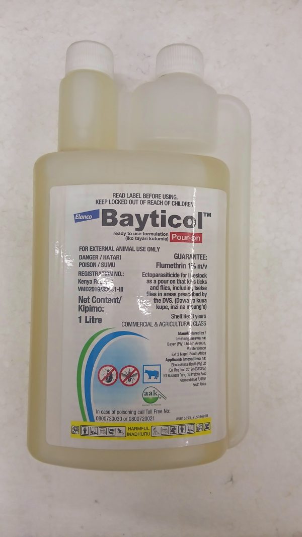 Bayticol Pour-On is a ready to use pour-on solution used for the treatment and control of biting lice, sucking lice, ticks and mange in cattle. It is highly effective against red water tick.