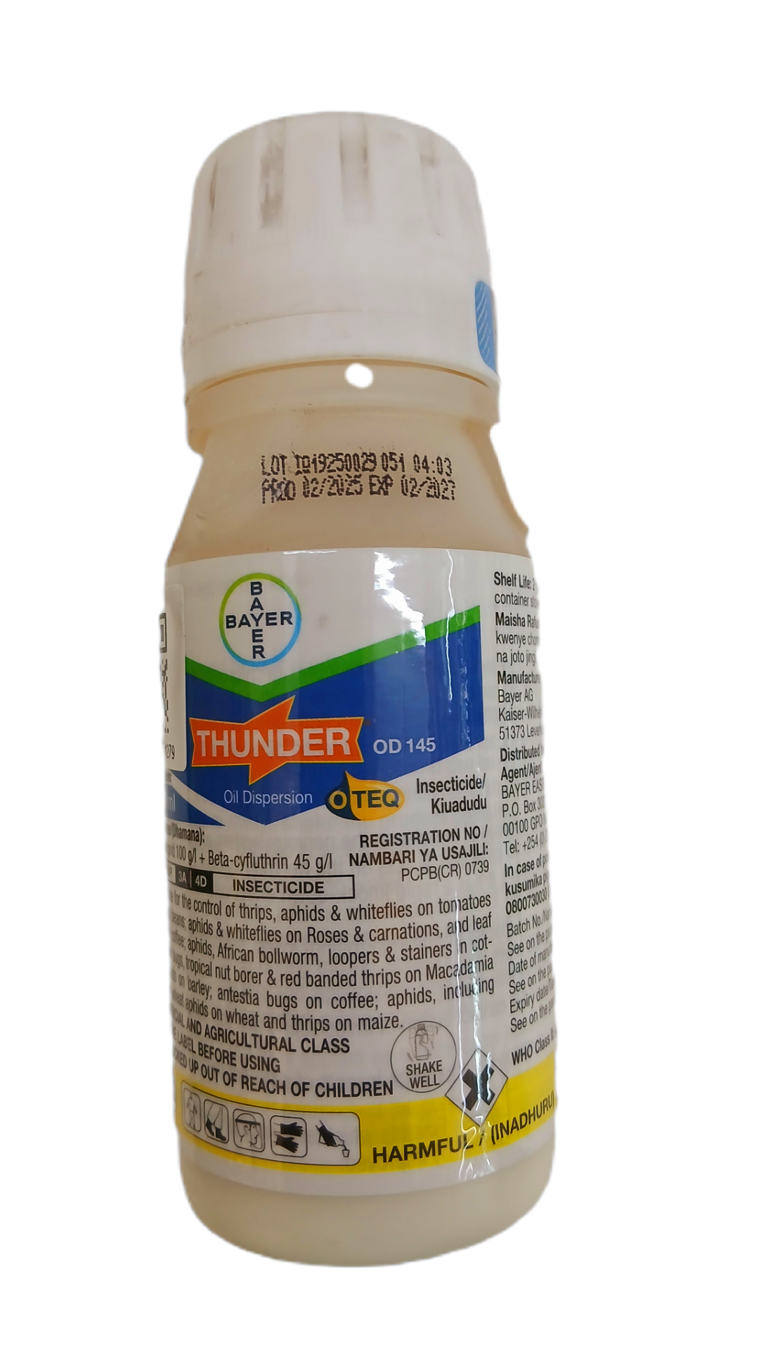 Thunder 145 OD is a broad-spectrum, systemic, and contact insecticide containing 100g/L Imidacloprid and 45g/L Beta-cyfluthrin. It provides fast knockdown and long-lasting control of sucking and chewing pests (aphids, thrips, whiteflies, caterpillars) in crops like tomatoes, vegetables, and cotton. It uses O-TEQ technology for better leaf coverage and rainfastness.